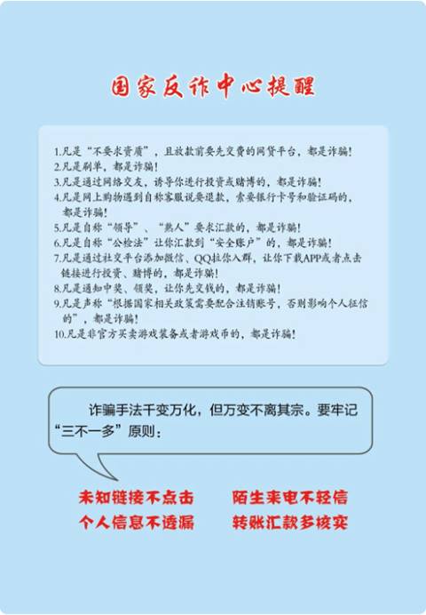 电信网络诈骗手法千变万化,但万变不离其宗,记住“三不一多”原则:
